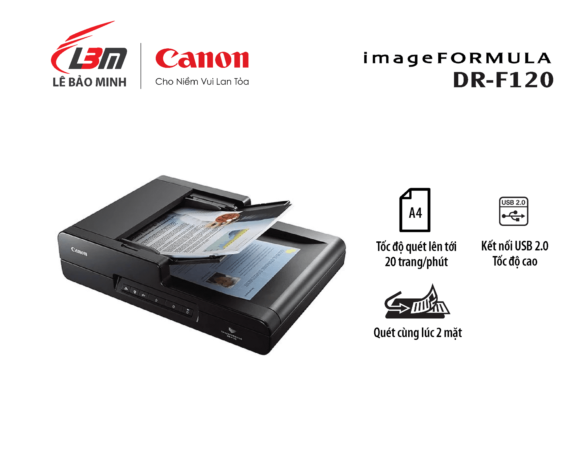 | Tốc Độ Scan | 20 trang/phút (một mặt), 36 trang/phút (2 mặt cùng lúc) |